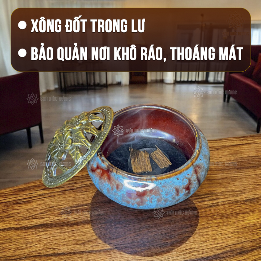 Cách làm: Bẻ hoặc dùng kéo cắt nhỏ miếng trầm. Mồi cháy viên than hoạt tính (Sơn Mộc Hương có tặng kèm) cho đến khi hồng đều rồi đặt vào lư sứ. Sau đó, đặt những mảnh trầm nhỏ lên trên than.