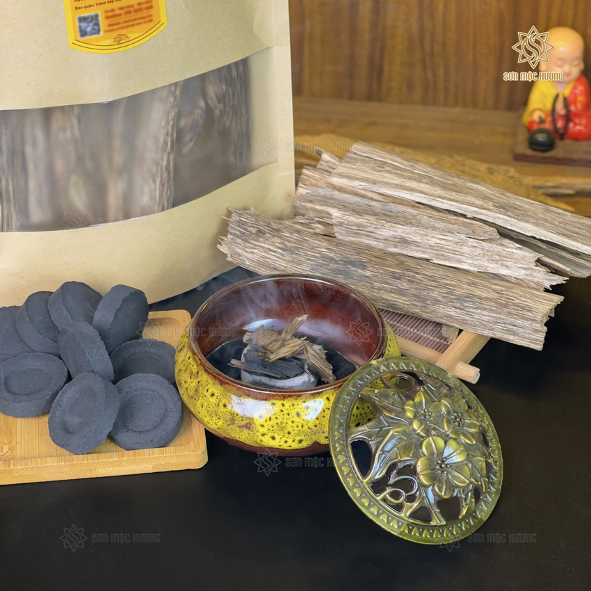Nếu anh chị đang tìm kiếm một giải pháp xông nhà giữ trọn vẹn nét mộc mạc và quyền năng của gỗ quý, thì Trầm hương miếng cao cấp từ Sơn Mộc Hương chính là câu trả lời. Khác với các dòng nhang nụ hay nhang cây, trầm miếng là những mảnh gỗ trầm tự nhiên chứa lượng tinh dầu dồi dào, mang lại làn khói thơm ngọt đặc trưng, thanh khiết mà khó có loại hương liệu nào sánh bằng.