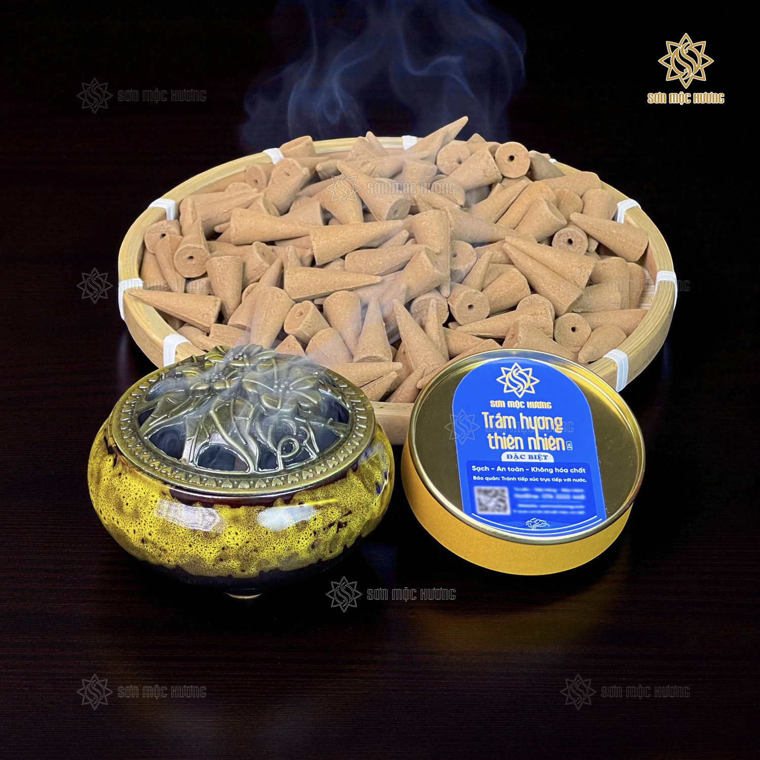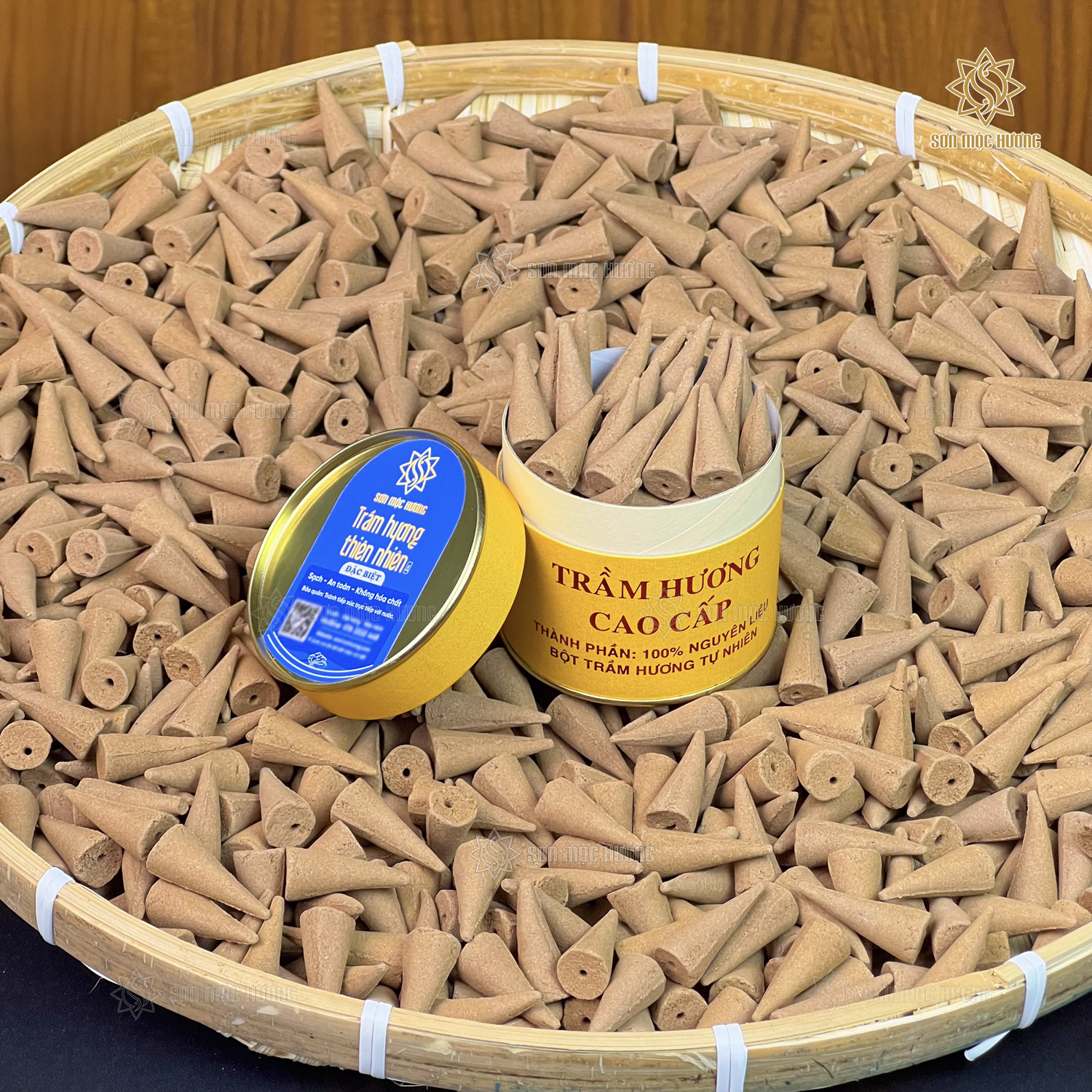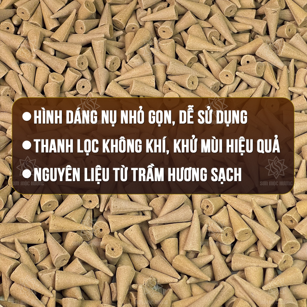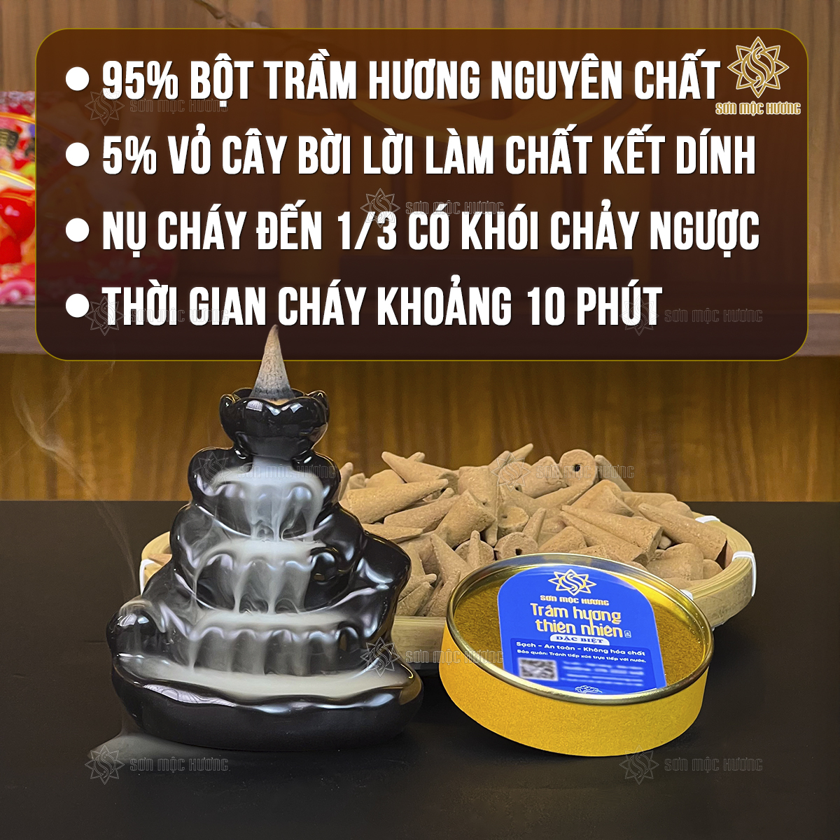 Nhang nụ trầm hương Sơn Mộc Hương từ bột trầm hương tự nhiên, giúp xông nhà, làm thơm phòng, an thần, thư giãn, và cải thiện chất lượng không khí, bảo vệ sức khỏe.
