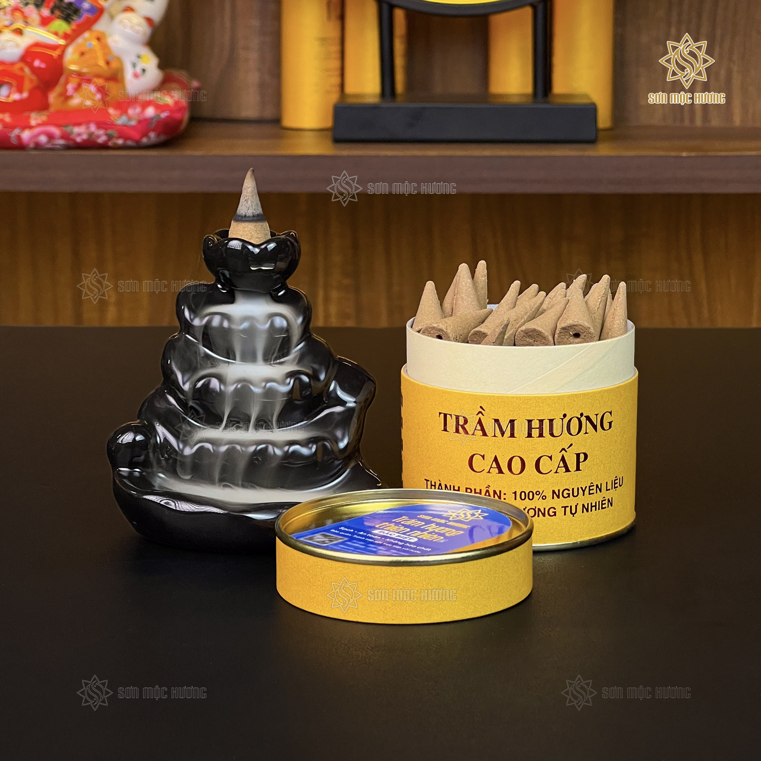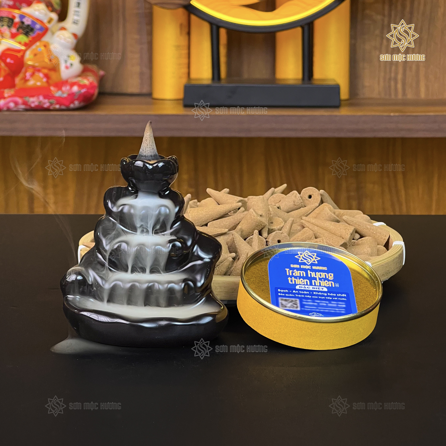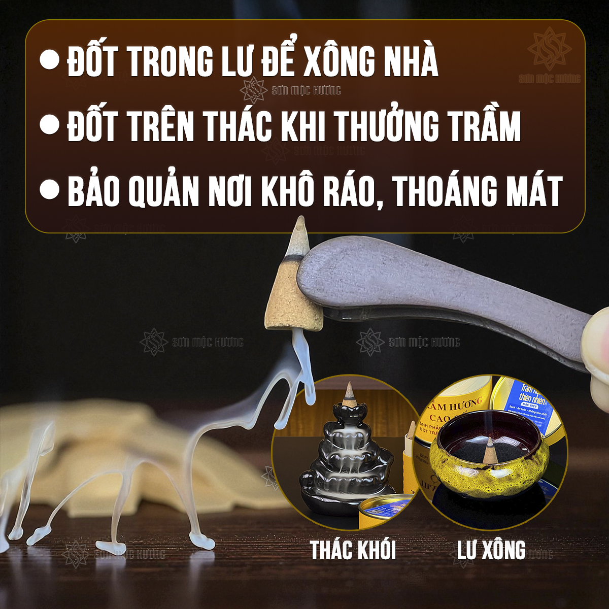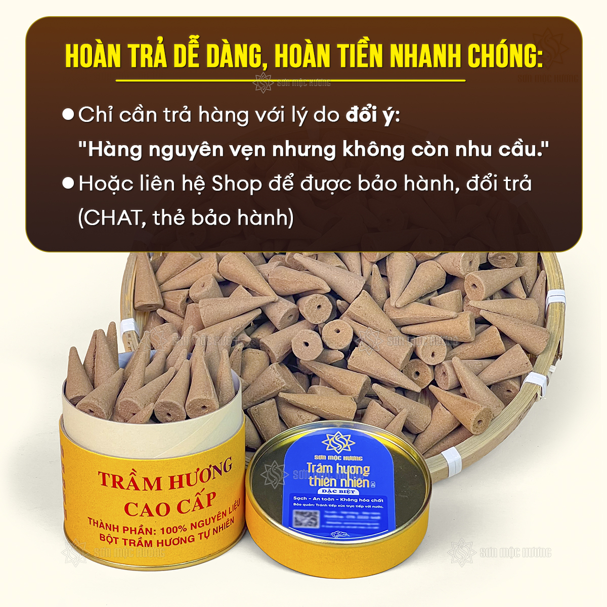 Nhang nụ trầm hương Sơn Mộc Hương từ bột trầm hương tự nhiên, giúp xông nhà, làm thơm phòng, an thần, thư giãn, và cải thiện chất lượng không khí, bảo vệ sức khỏe.