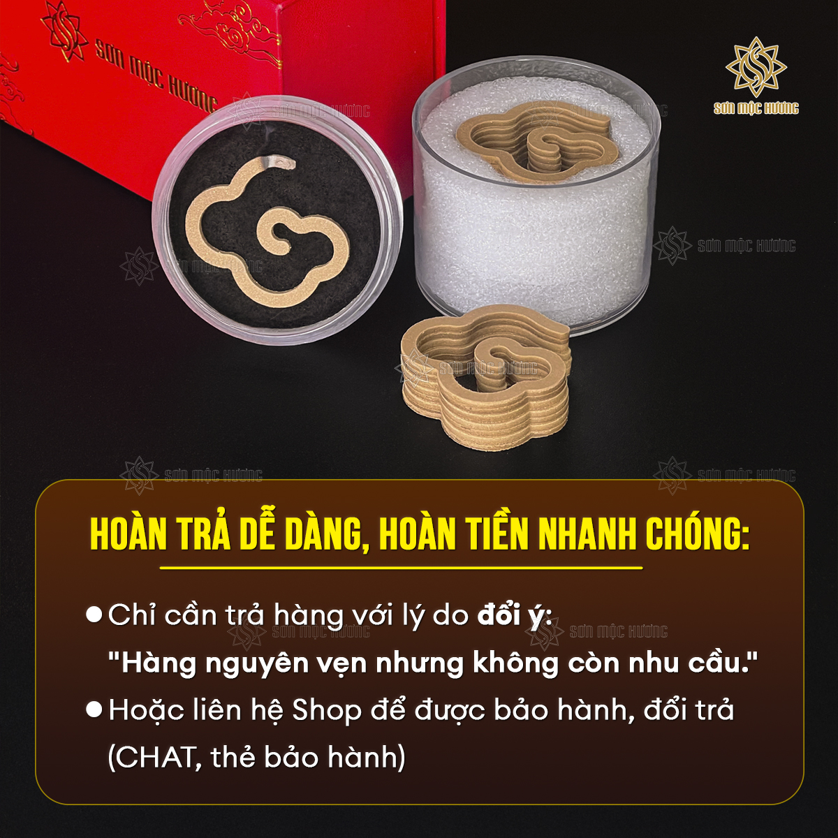 Sơn Mộc Hương cam kết mang đến sản phẩm chất lượng cao, sử dụng trầm tự nhiên được chọn lọc kỹ lưỡng. Với sự tỉ mỉ trong từng khâu chế tác, nhang vân mây của Sơn Mộc Hương tự hào là lựa chọn đáng tin cậy, mang đến sự khác biệt rõ nét so với các sản phẩm trôi nổi trên thị trường. Dù có nhiều sản phẩm cùng kiểu dáng nhưng khác nhau về mùi hương. Khách hàng cần lựa chọn nơi uy tín.