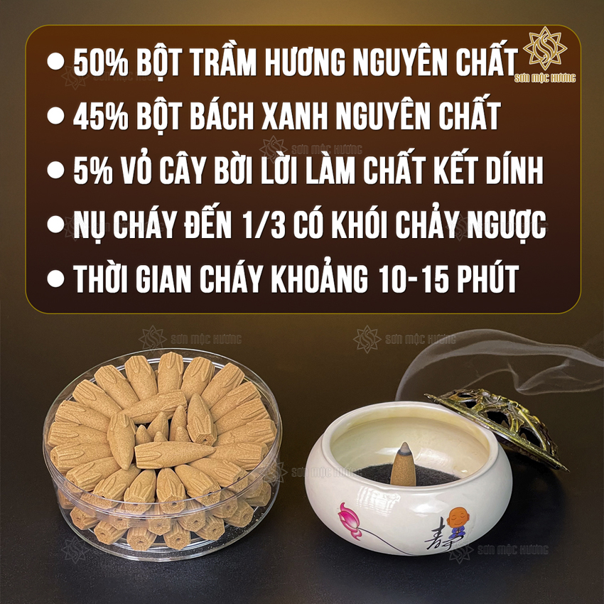 - Thành phần: Bột trầm hương tốc, bột gỗ bách xanh, vỏ cây bời lời tự nhiên