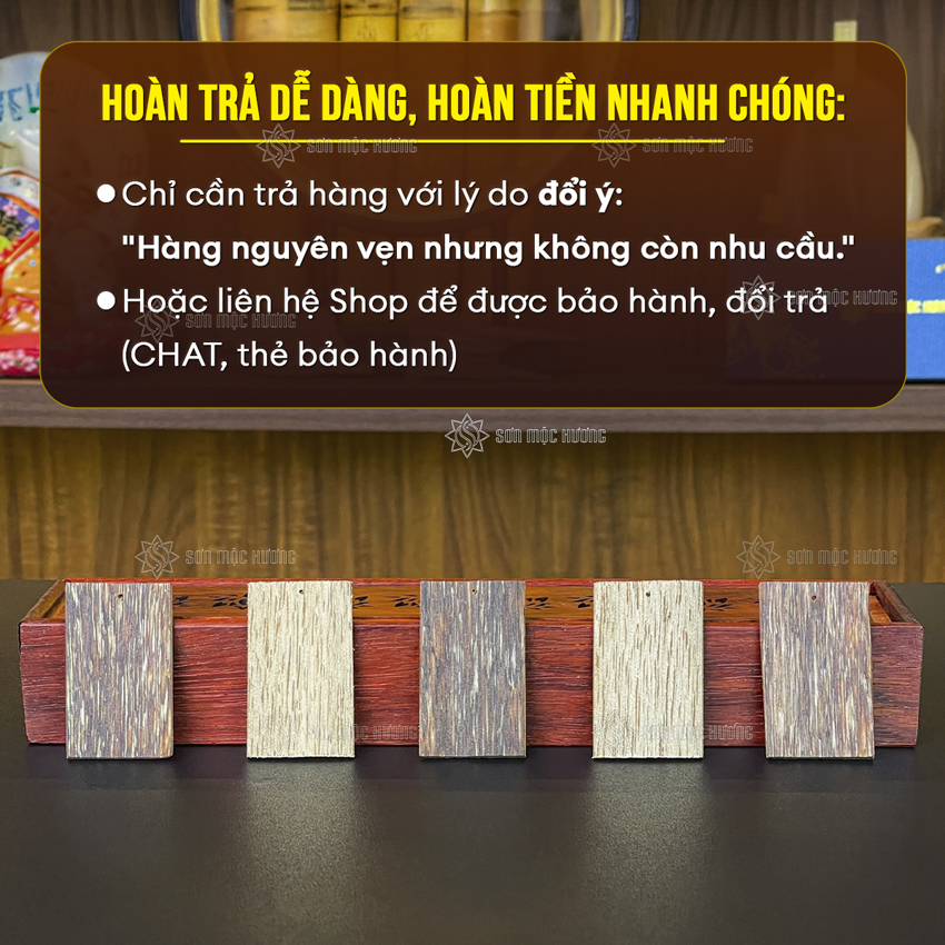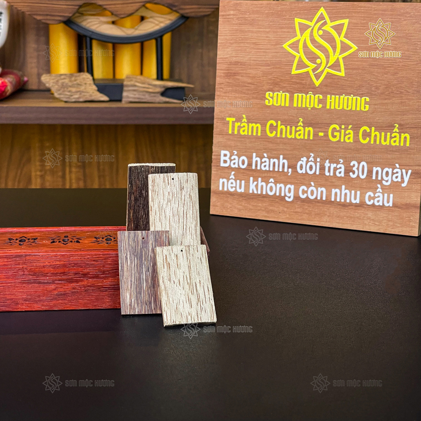 Slogan: SƠN MỘC HƯƠNG - TRẦM CHUẨN - GIÁ CHUẨN. BẢO HÀNH ĐỔI TRẢ TRONG 30 NGÀY.
