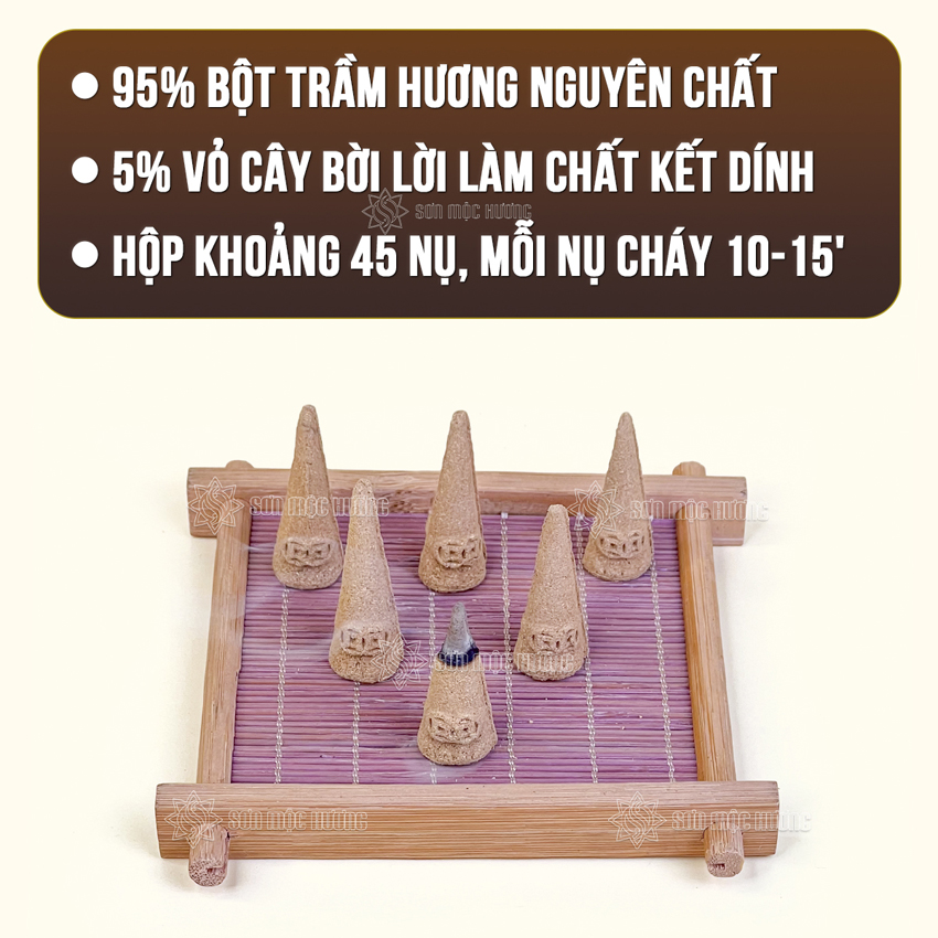 + Thành phần: 95% bột trầm hương, 5% bột keo cây bời lời tự nhiên