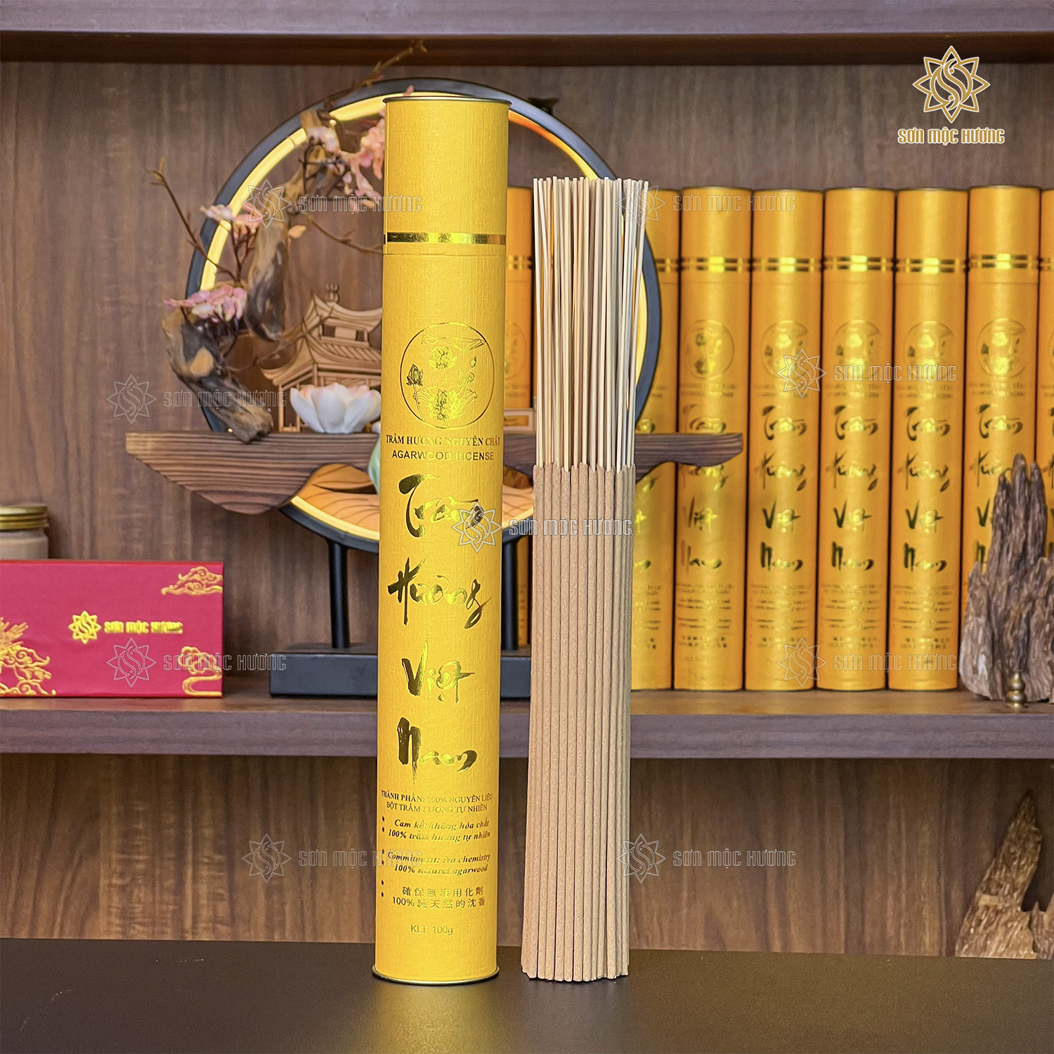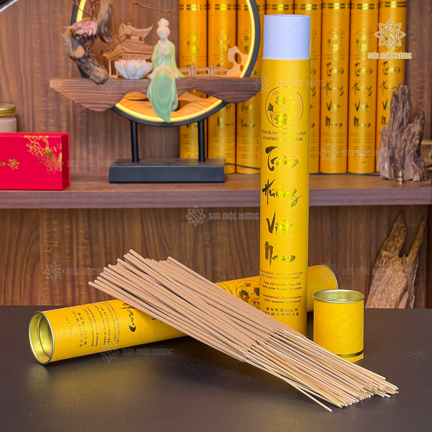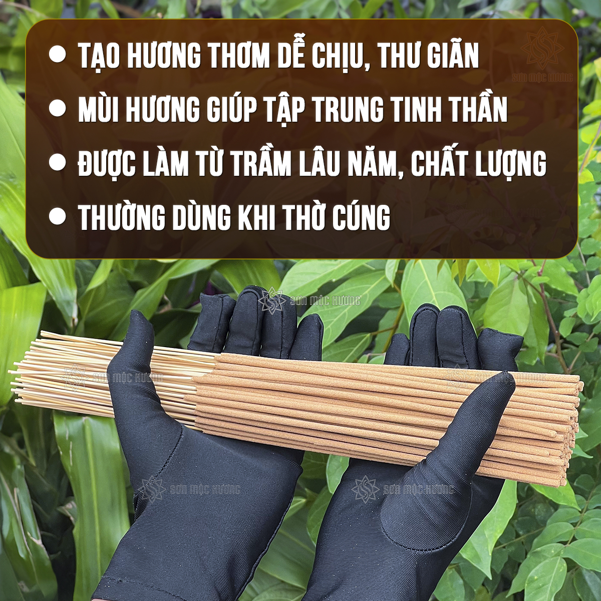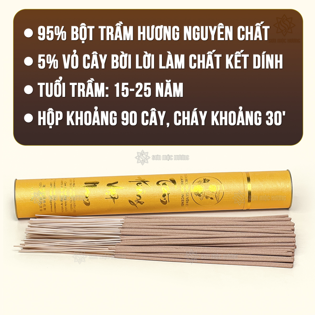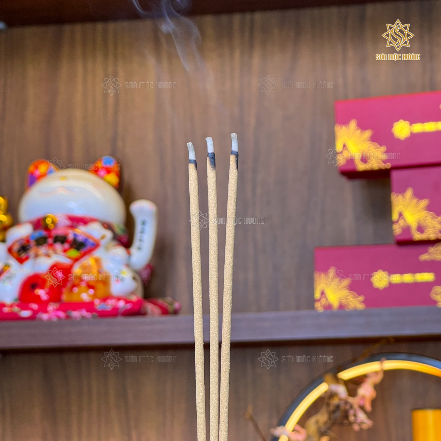 Nhang trầm hương thơm tự nhiên Sơn Mộc Hương là loại nhang có thành phần chính là bột trầm nguyên chất cùng với chất kết tinh là keo cây bời lời cùng với tăm tre tạo nên cây nhang hoàn chỉnh. Khi đốt dâng hương nhang trầm có mùi hương dịu nhẹ, ngọt thanh, dễ chịu cũng nhờ tinh dầu trầm có trong bột nhang.